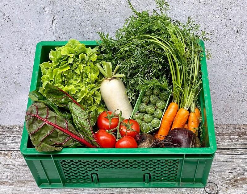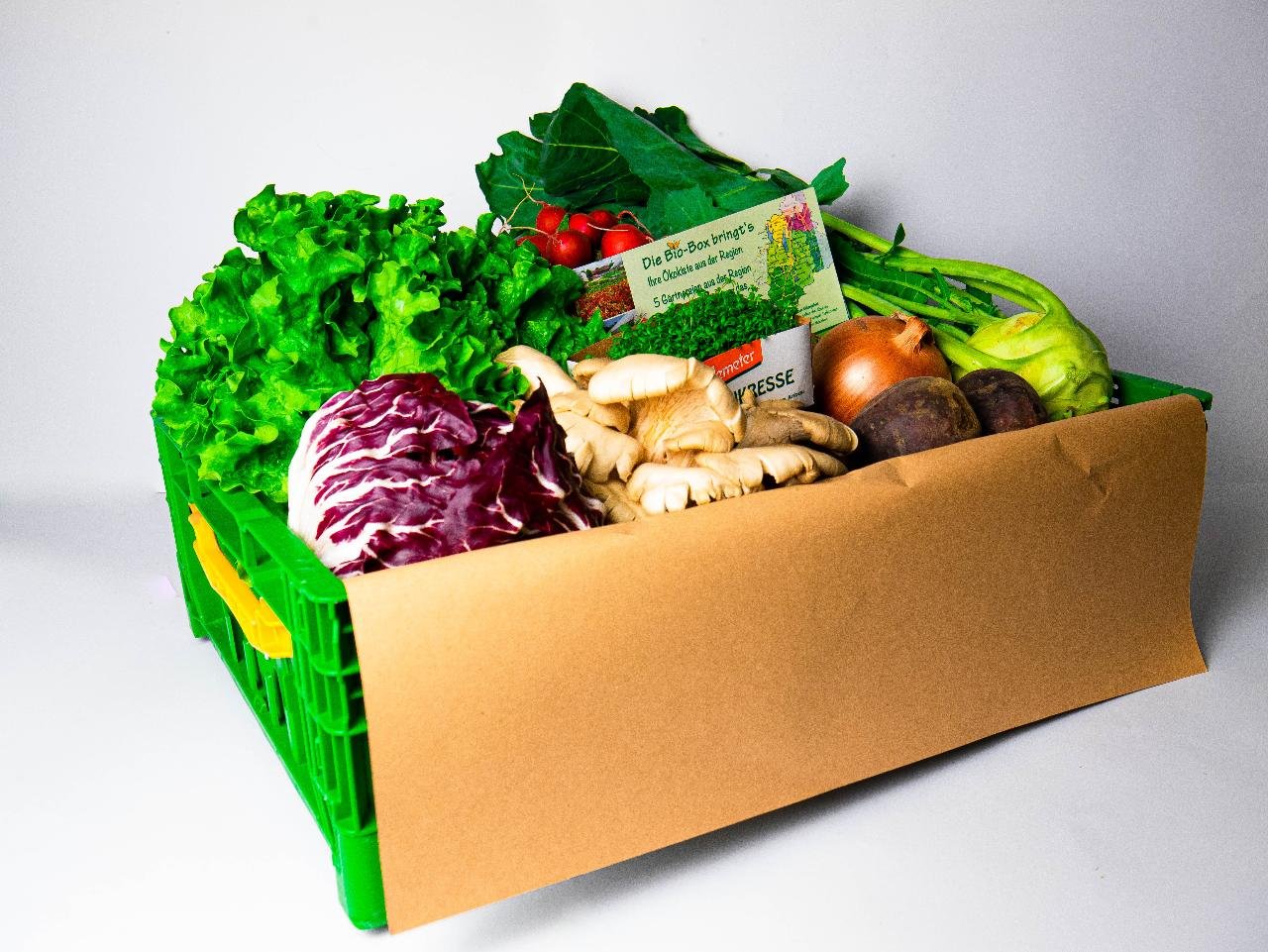 ein Grundsortiment an Gemüse, Salat und Kräutern nach Saison. Die Boxen werden abwechslungsreich jede Woche neu zusammengestellt. Passend dazu gibt's jede Woche ein Rezept im Newsletter.