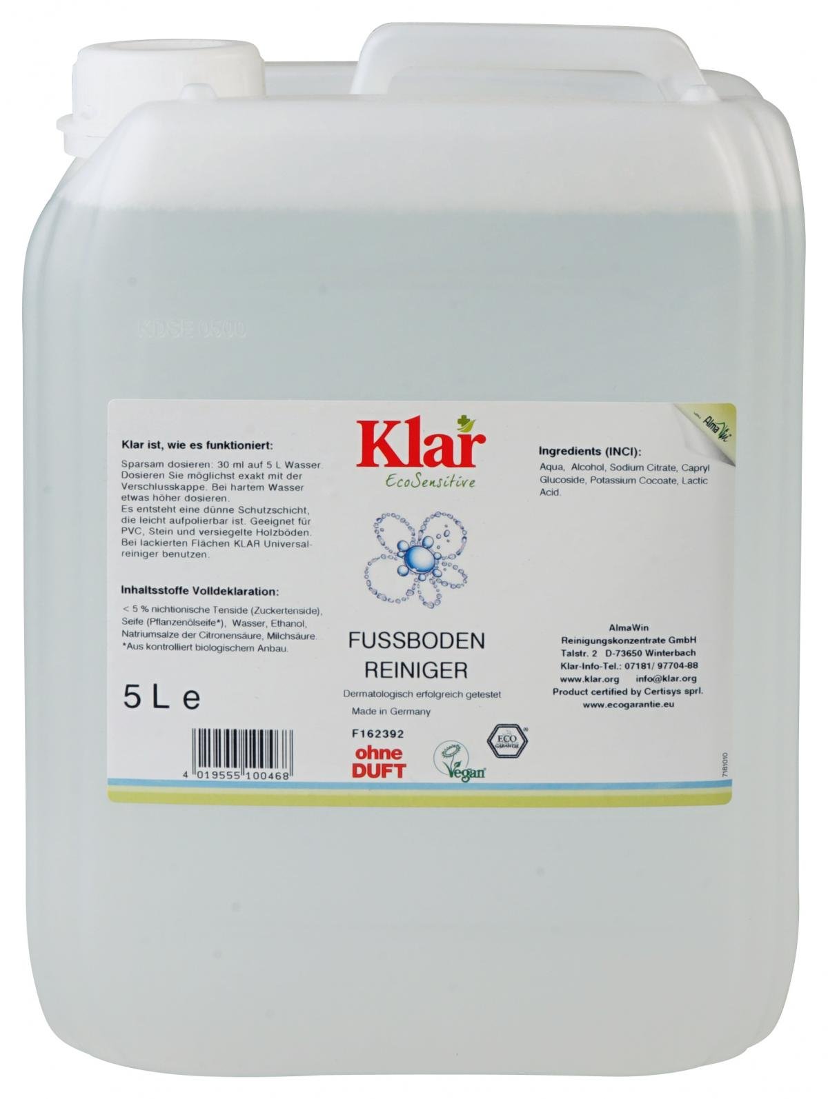 weniger anzeigenBestehend aus Pflanzenölseife reinigt er kraftvoll und pflegend und entfernt sicher Verschmutzungen. Der Reiniger hinterlässt einen leichten Schutz- und Pflegefilm auf der Oberfläche. KLAR Fußbodenreiniger ist geeignet für unglasierte Keramik, bruchraue Steinböden, Linoleum, gewachste, geölte oder versiegelte Holzböden und Kork, PVC, CV oder Gummi.